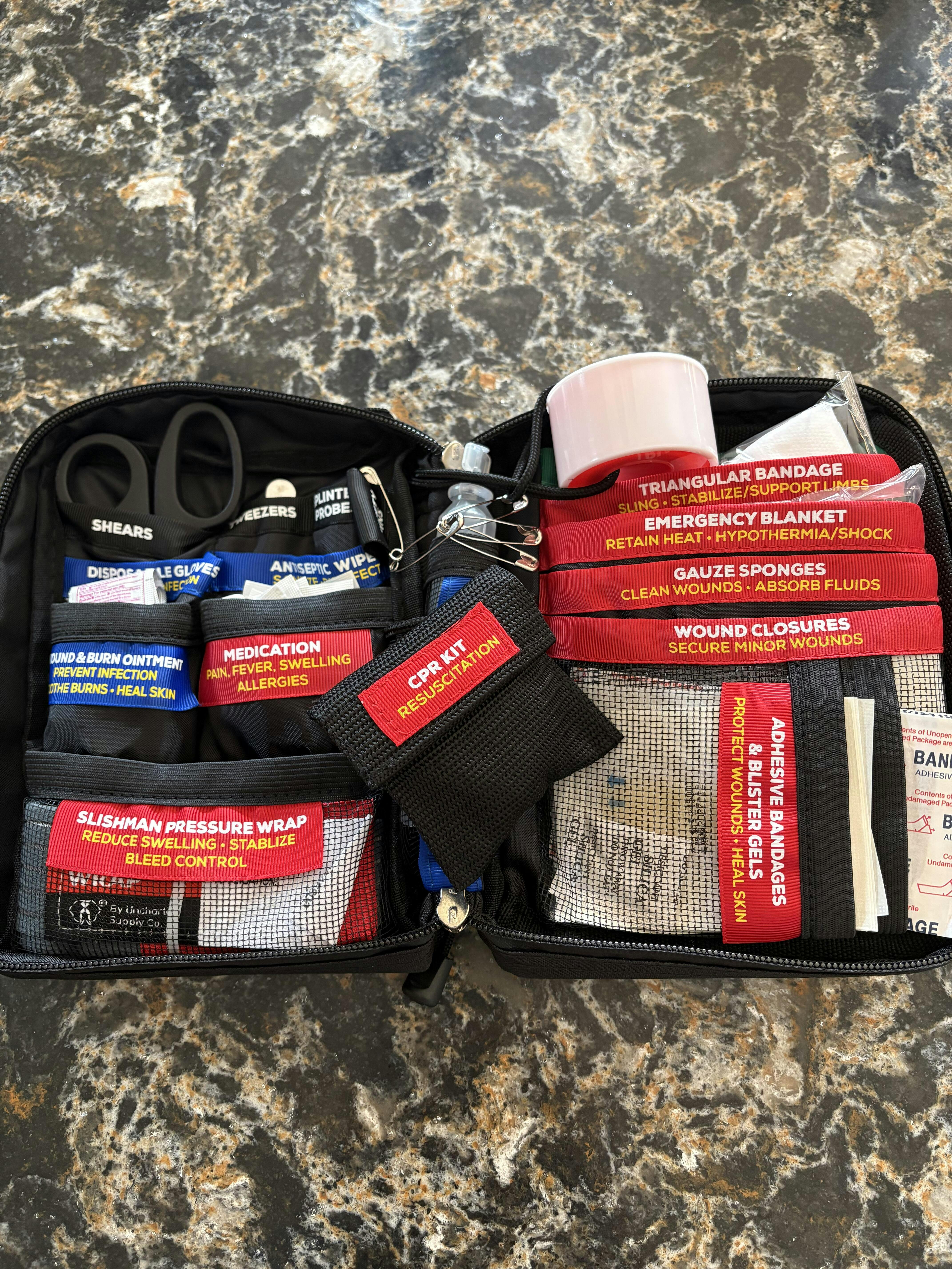 New and Included: Slishman pressure wrap, Sharpie, blister bandages, burn cream, triple antibiotic, Benadryl, Aspirin, and Ibuprofen. The Slishman Pressure Wrap was created to make applying a tourniquet or pressure bandage simpler for an untrained user. It can also be more easily applied one-handed, allows a much broader application use as a pressure bandage for a more longitudinal arm or leg laceration, and allows for placement of gauze underneath. It can even be used to secure a splint in the event of a fracture. We love this thing!